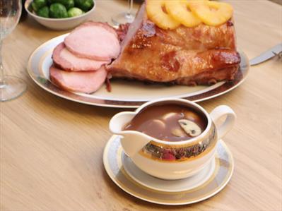 Hrærið saman í lítilli skál dijon sinnepi, púðursykri og 1 tsk af ananassafa. Penslið á hrygginn og raðið ananassneiðum þar ofaná.