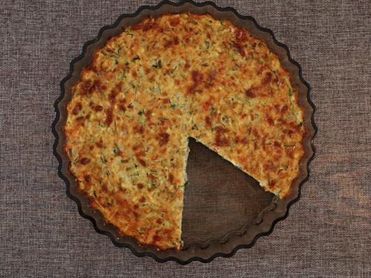 Þá er komið að því að undirbúa bökunarmót eða pie disk með því að spreyja hann með olíu (ég nota pam). Blöndunni er hellt í mótið og ferskur parmesan er rifinn yfir áður en sett er inn í ofn. Baka í 30 mínútur.