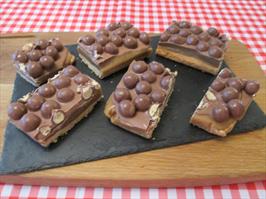 Bræða að lokum rjómasúkkulaðið yfir vatnsbaði og smyrja yfir karamelluna. Hella Maltesers kúlum yfir. Láta súkkulaðið stífna aðeins og skera síðan í bita.