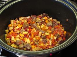 Skera grænmetið í litla bita. Brúna kjötið og mýkja laukinn í potti. Rífa eða pressa hvítlaukinn út í og bæta öllu hinu útí nema gulrót og kartöflu. Sjóða í 2-3 klst. Bæta kartöflu og gulrótum samanvið og sjóða í 30 mín í viðbót.